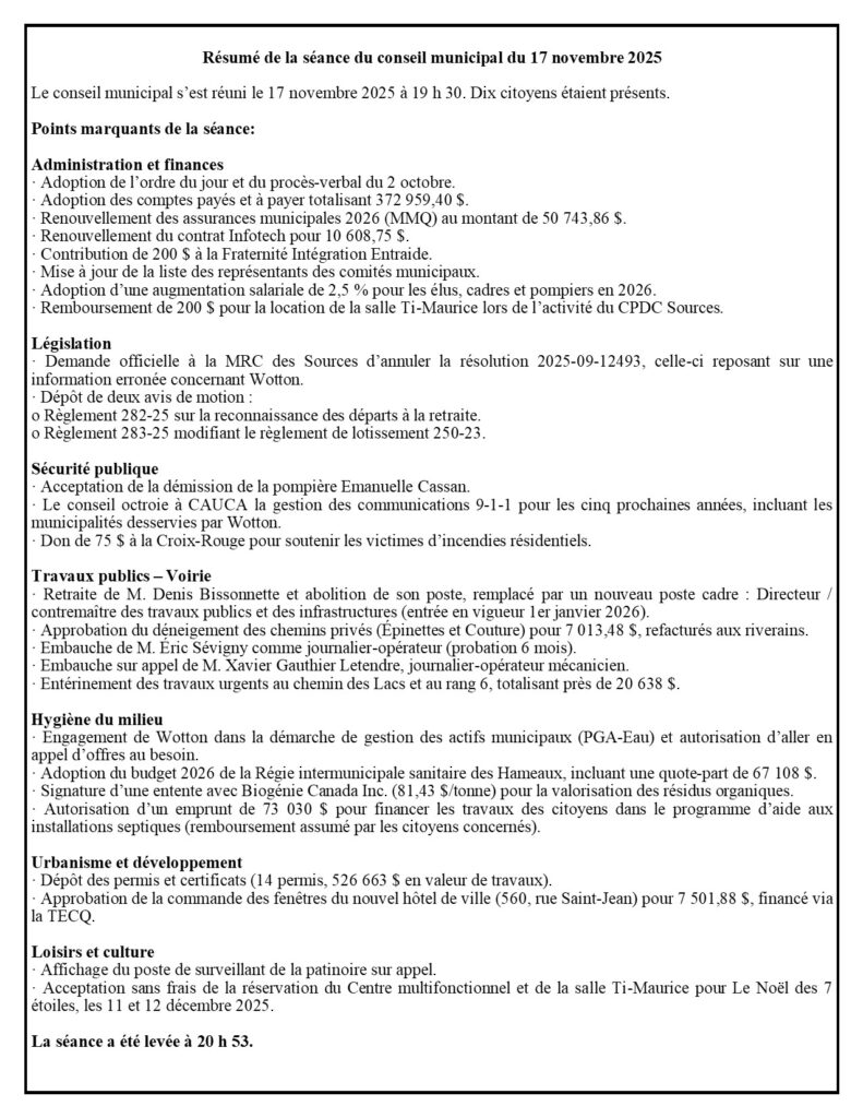 Bulletin Perspective – Novembre 2025 Auteur/autrice de la publication :Kim Mercier Publication publiée :25/11/2025 Post category:Bulletin / Nouvelle Partagez Partager ce contenu Ouvrir dans une autre fenêtre Facebook Vous devriez également aimer Invitation à l’assemblée publique de consultation sur les règlements d’urbanisme révisés – 27 juin 2023 – 19h – Salle du conseil municipal (396, rue Mgr-L’Heureux, Wotton) 07/06/2023 Offre d’emploi – Technicien(ne) en loisir partagé(e) 10/05/2024 Fadoq de Wotton – Voyage 2024 11/03/2024